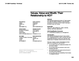 Through the 2000s design practice increasingly realised that a great user interface – even a great user experience – was not sufficient if the offering was not valued by users and customers. This CHI workshop held in Florence, Italy, explored the territory of ‘value-centered HCI’ searching for ways to accommodate financial and cultural (moral) values into the equation.
